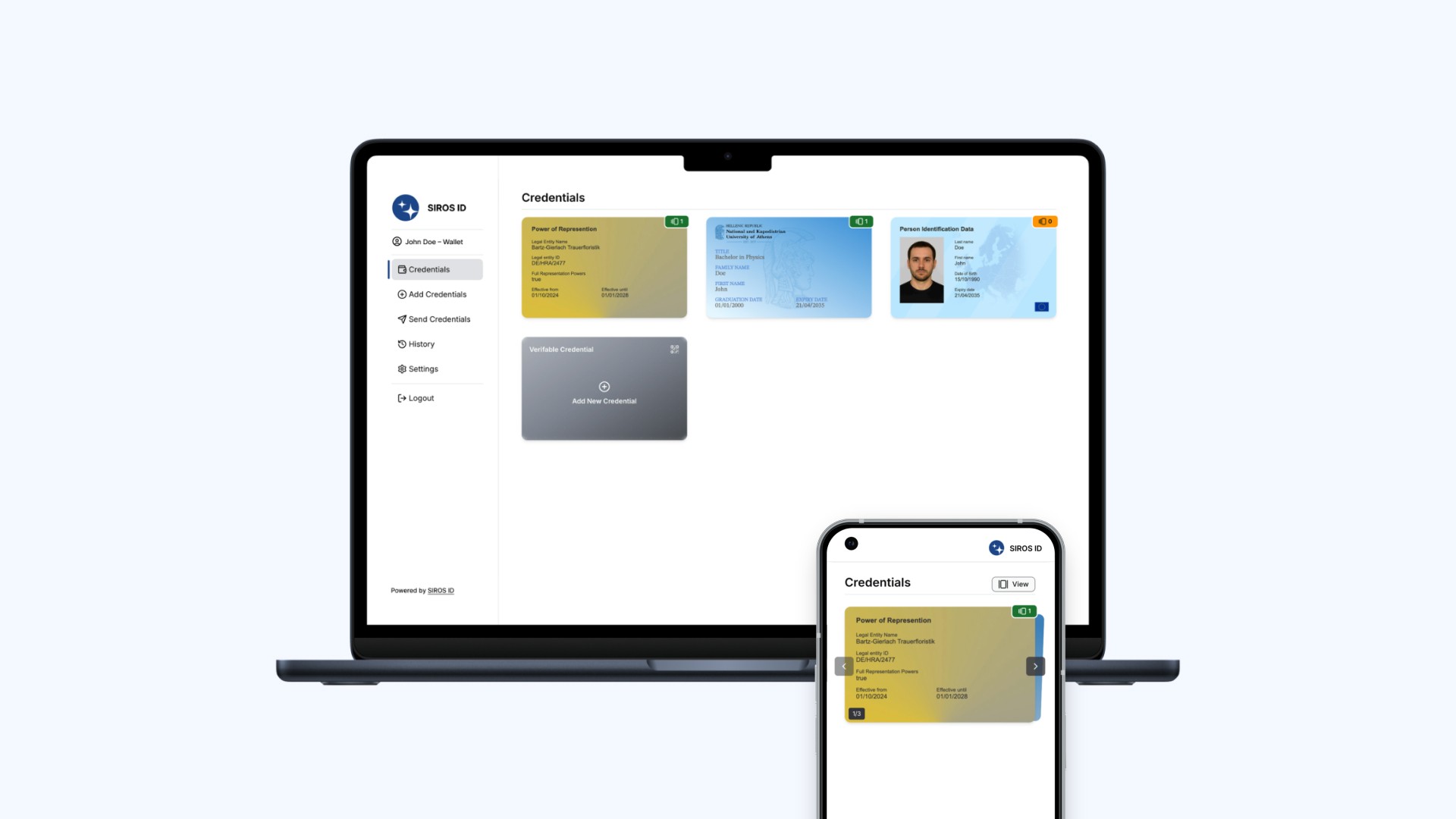 Many wallets focus only on individuals. SIROS also supports legal entity use cases, such as organizations, services, or agents acting on behalf of an entity. This reflects how the real world works: not every interaction is person-to-person, and not every credential belongs to a single human.